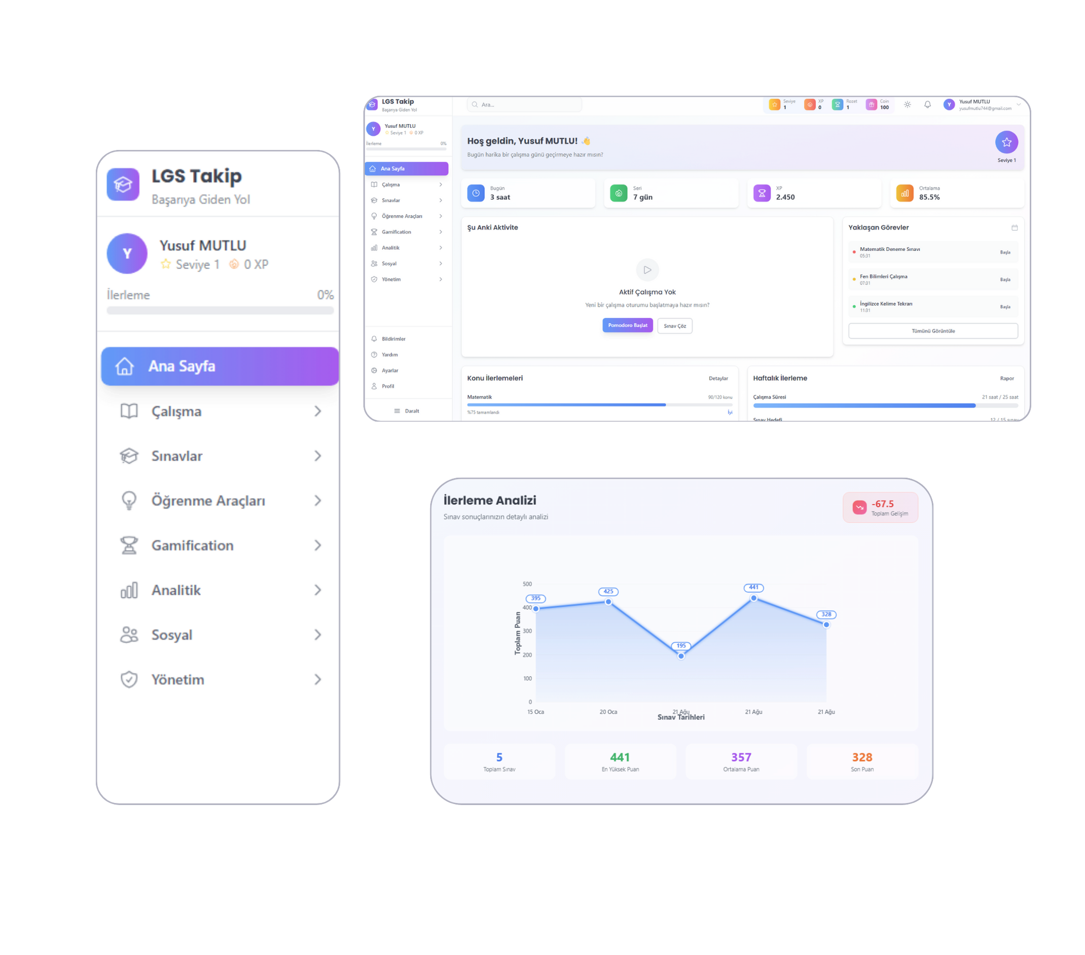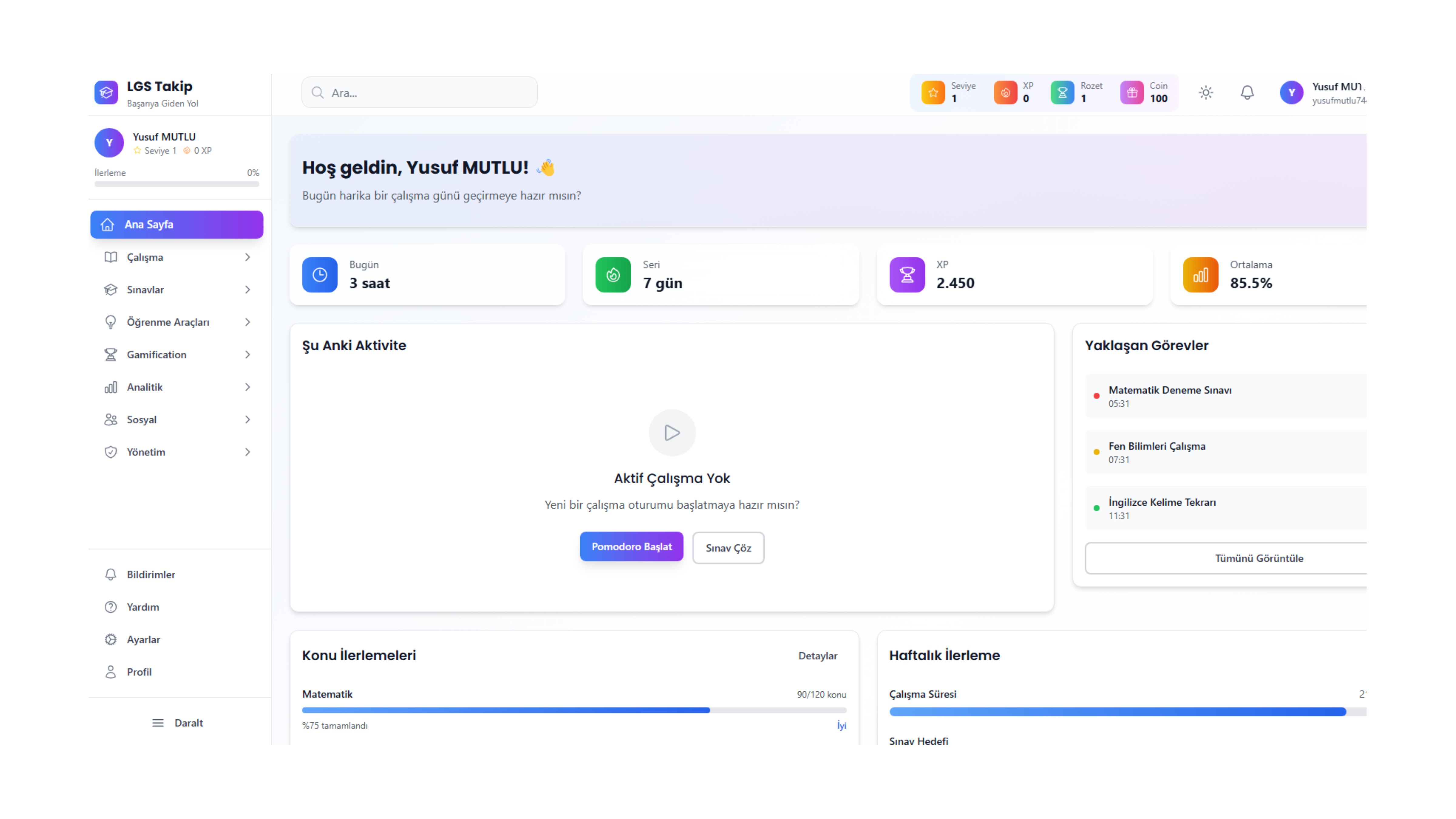 Konu bazlı analizler, ilerleme grafikleri ve kişiselleştirilmiş geri bildirimlerle gelişiminizi adım adım takip edebilirsiniz. Her çalışma, sistem tarafından kaydedilir ve yorumlanır.