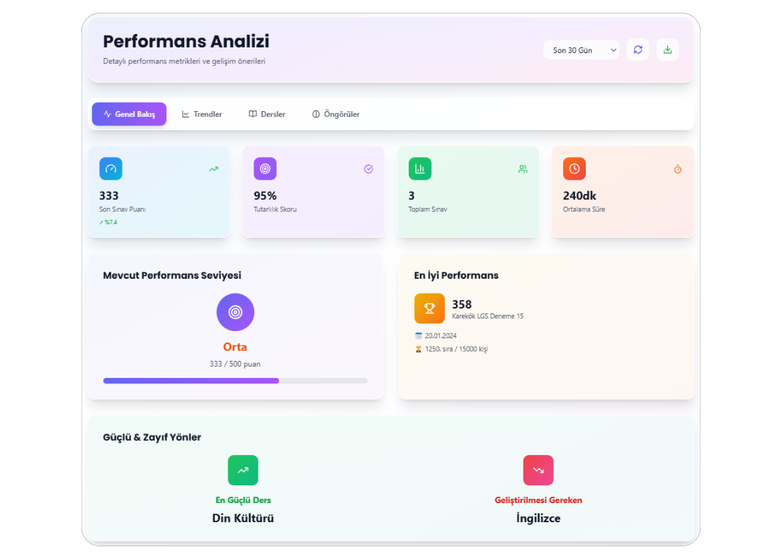 OdakPlus Performans Analizi, LGS hazırlığında öğrencinin güçlü ve gelişime açık yönlerini anlık olarak gösterir. Modern arayüzüyle grafikler, konu analizleri ve zamanlama verileri sade biçimde sunulur. Kişiye özel gelişim haritası, tekrar önerileri ve başarı tahminleriyle öğrenme süreci daha bilinçli ve etkili hale gelir.
